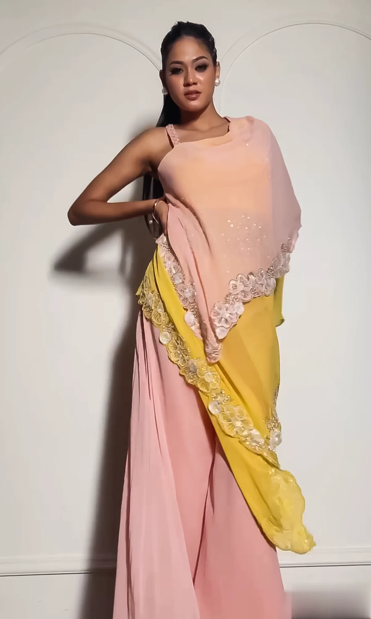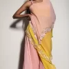 This exquisite Double Layer Indowestern Dress is a stunning blend of peach and yellow hues, crafted from lightweight and flowy georgette fabric. The dress features a unique design with two layers that create a beautiful, ethereal look. Perfect for festive occasions and special events.