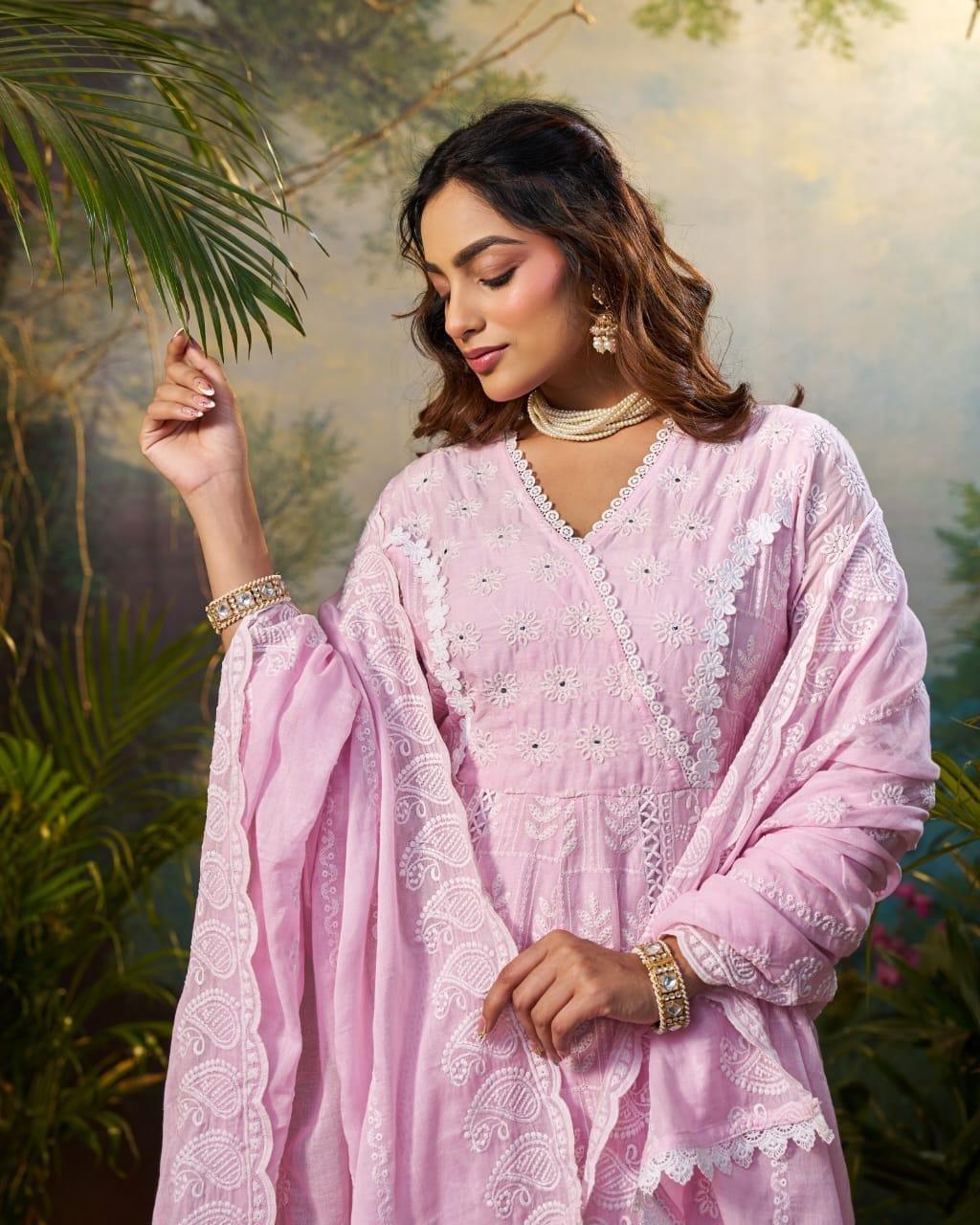 Elevate your ethnic wardrobe with this elegant Mul Cotton Anarkali Set in soft pink. Crafted with delicate embroidery, it features a flowy silhouette, intricate lace detailing, and a matching dupatta—perfect for festive occasions and daytime celebrations.