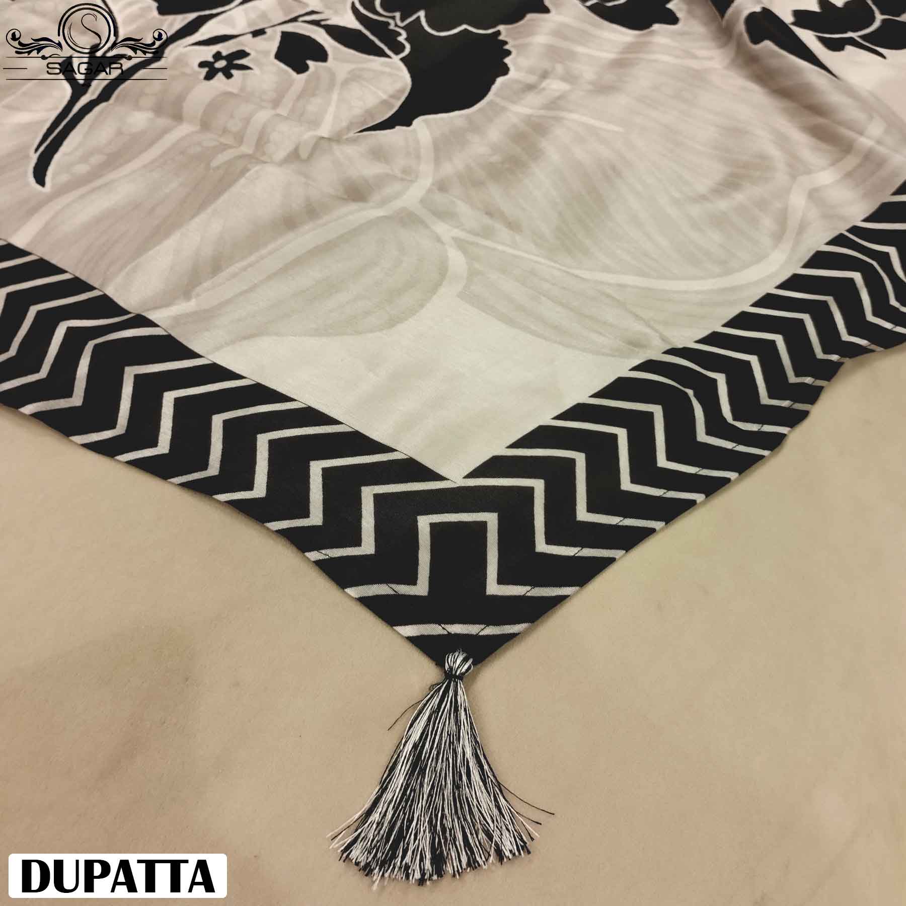 DUPATTA- Beige with zig zag patterns on borders and tassles on corner