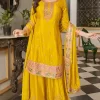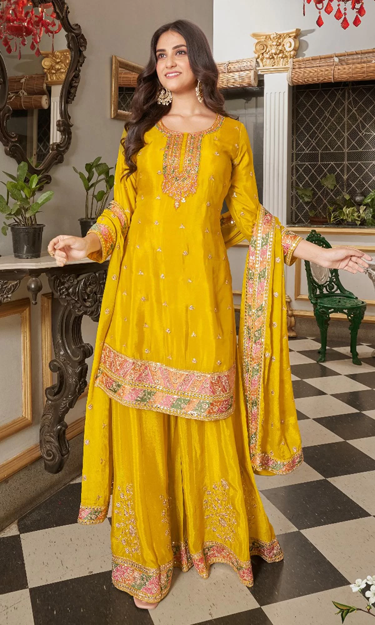 Radiate elegance with our Yellow Embroidered Chinon Sharara Suit, featuring intricate sequin, mirror, thread, and zari work. The suit and dupatta are adorned with all-over buttis, while the neck, daman, and sharara showcase heavy embroidery. Perfect for weddings, haldi and festive occasions, this vibrant yellow ensemble combines traditional craftsmanship with modern flair.
